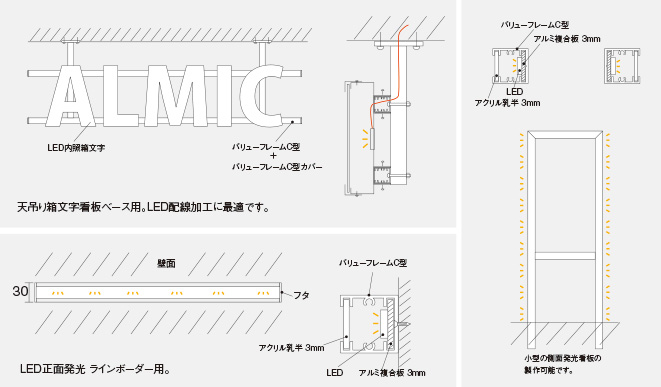 LED配線加工用、LEDラインボーダー用、LED関節照明用など。 LEDを使用する様々な用途に最適なオリジナルアルミフレーム部材。 規格は溶接にも最適な生地材と屋内用途にもマッチするブラック(つや消)をラインナップ。